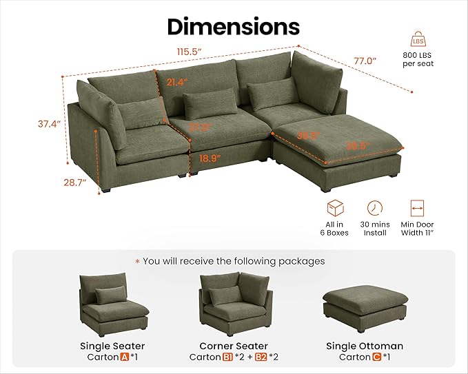 - 【Shipped in Six Packages for Easy Setup】To enhance your convenience, the sectional will be delivered in six packages, allowing for easier handling and assembly. Each package is carefully packed to ensure safety during transit, and while they may arrive at different days, rest assured that our professional customer service is ready to assist you with any concern. The thoughtful design makes the setup process simpler and more efficient,ensuring you enjoy your sectional without any hassle