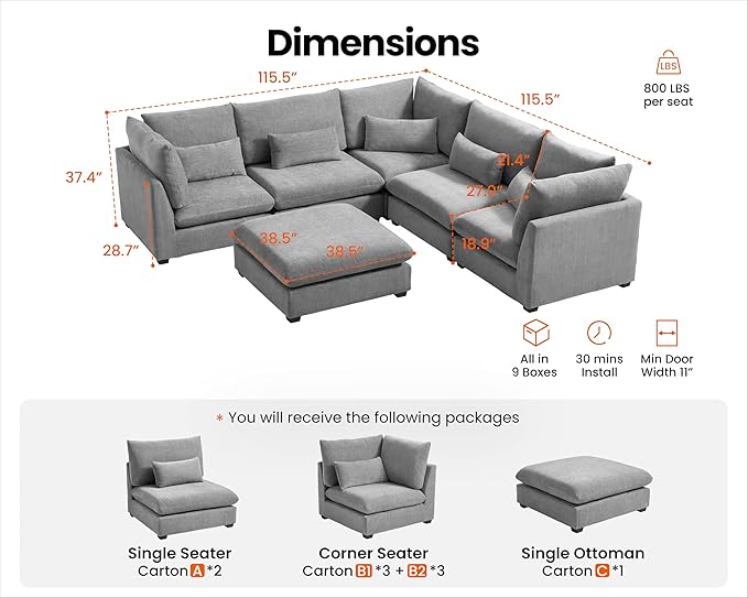 - 【Shipped in Nine Packages for Easy Setup】To enhance your convenience, the sectional will be delivered in nine packages, allowing for easier handling and assembly. Each package is carefully packed to ensure safety during transit, and while they may arrive at different days, rest assured that our professional customer service is ready to assist you with any concern. The thoughtful design makes the setup process simpler and more efficient,ensuring you enjoy your sectional without any hassle