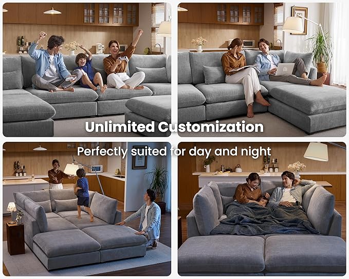 - 【Endlessly Modular for Tailored Space】Transform your space with ease using the fully modular design. Whether you need a cozy L-shape for movie nights, a U-shape or a spacious sleeper for entertaining, each piece reconfigures to fit your needs. This sectional adapts to any room, offering customizable comfort. Perfect for living rooms, home offices, or entertainment spaces, it provides flexibility without complicated tools. Enjoy seamless reconfiguration for relaxing, working, or entertaining