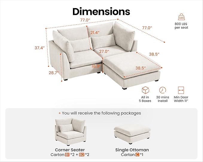 - 【Shipped in Five Packages for Easy Setup】To enhance your convenience, the sectional will be delivered in five packages, allowing for easier handling and assembly. Each package is carefully packed to ensure safety during transit, and while they may arrive at different days, rest assured that our professional customer service is ready to assist you with any concern. The thoughtful design makes the setup process simpler and more efficient,ensuring you enjoy your sectional without any hassle