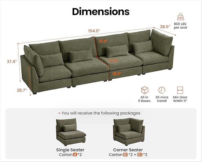 - 【Tool-Free Assembly in Minutes】Assemble your sofa in no time—no tools required! The modular design allows for quick and easy setup using high-quality U-shaped stainless steel connectors, ensuring a secure fit between each module. Reconfigure your sectional effortlessly and enjoy it in as little as 20 minutes. Perfect for those who value convenience and flexibility, this sectional offers a seamless assembly experience and provides total comfort from the moment it arrives