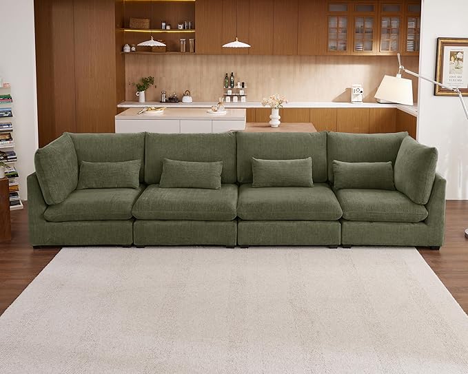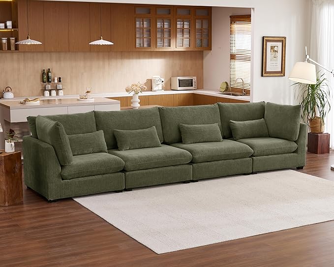 Oversized Modular Sofa, Extra Deep Cloud Chenille Sectional Couch with Ottoman Chaise, Fluffy Chenille 4 Seater Sofa for Living Room, Villa (Basic 4 Seater, Chenille Green)