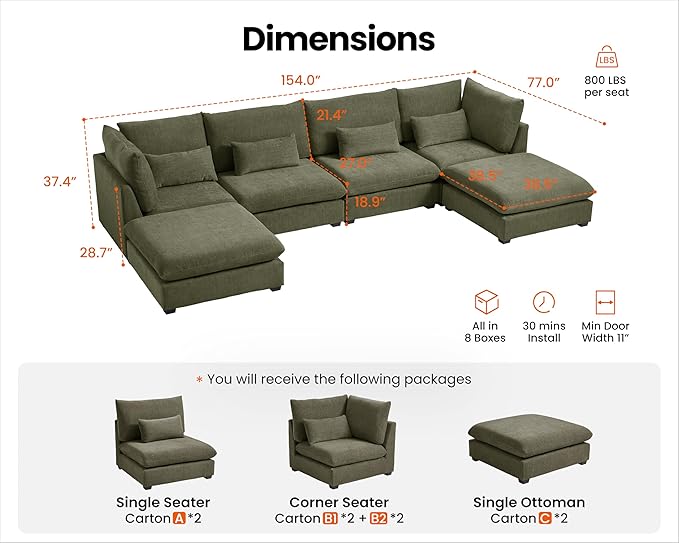 - 【Shipped in Eight Packages for Easy Setup】To enhance your convenience, the sectional will be delivered in eight packages, allowing for easier handling and assembly. Each package is carefully packed to ensure safety during transit, and while they may arrive at different days, rest assured that our professional customer service is ready to assist you with any concern. The thoughtful design makes the setup process simpler and more efficient,ensuring you enjoy your sectional without any hassle
