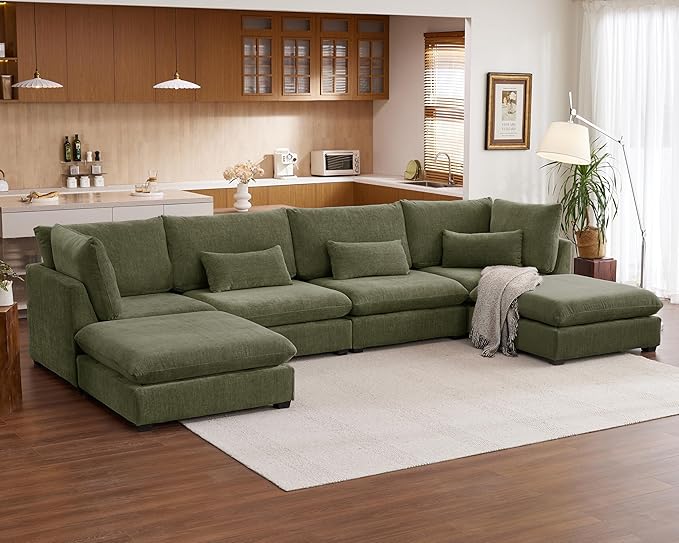 Oversized Modular Sofa, Extra Deep Cloud Chenille Sectional Couch with Ottoman Chaise, Fluffy Chenille 6 Seat U-Shaped Sofa for Living Room, Villa (U Shape 6 Seater, Chenille Green)