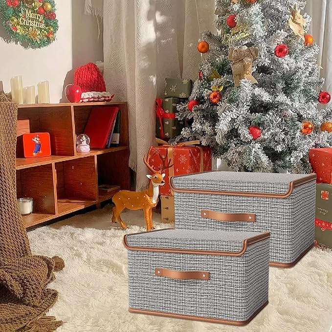 Tuza 2 Pack Storage Bins with Lids, Collapsible Closet Organizer Container, Fabric Organizer Box with Handles, Decorative Storage Boxes with Lids for Organizing Clothes, Sheet, Light Grey, Extra Large