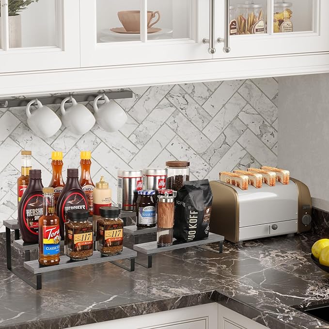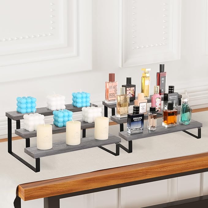 YINMIT Wooden Display Riser Stand, Tiered Perfume and Cologne Organizer Stand, 3 Tier Spice Rack Organizer, Rustic Display Shelf for Candles (3 Tier,2Pack,Grey)