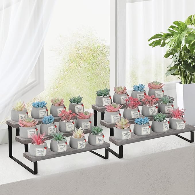 - Convenient Design: The stepped design makes efficient use of your counter space. This wooden display riser is a great idea for displaying toy figurines in cabinets, celebrating party desserts, and cosmetics on the dresser. The raised tiers help to create an eye-catching feature for your items.