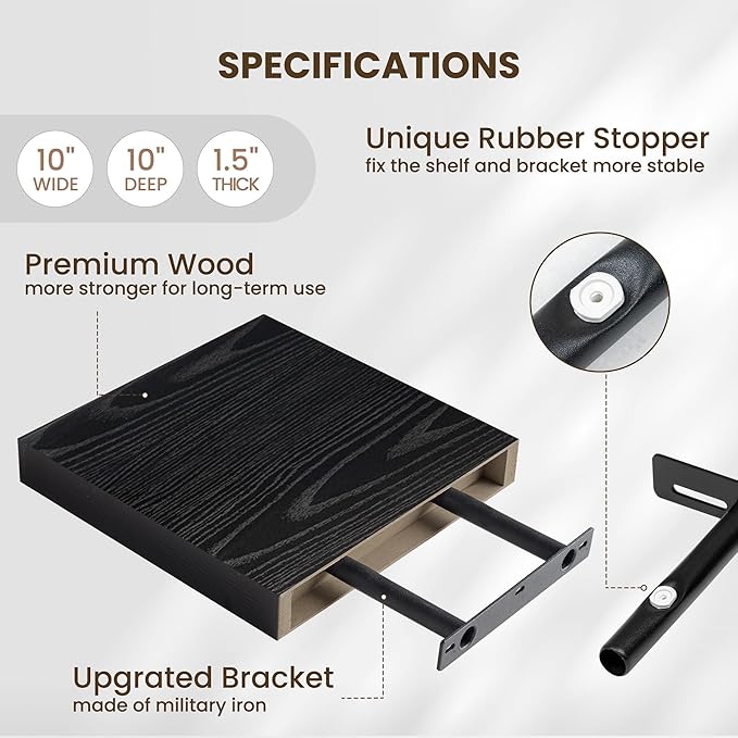 Fun Memories Floating Shelves for Wall 10 Inch, 10 Inch Deep Square Wall Shelves, Bathroom Storage Shelves Over Toilet, Wood Floating Shelves for Living Room Bedroom, Black, Set of 2