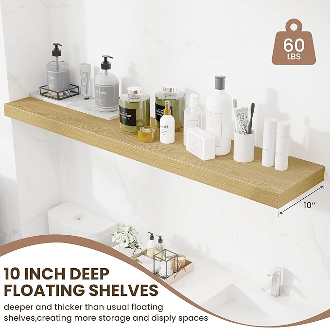 - STYLISH & PRACTICAL: These 10-inch deep floating shelves offer a simple rustic charm and are made from permium engineered wood. With their smooth, natural finish, they add warmth and personality to any room, fitting seamlessly into both modern and classic interiors