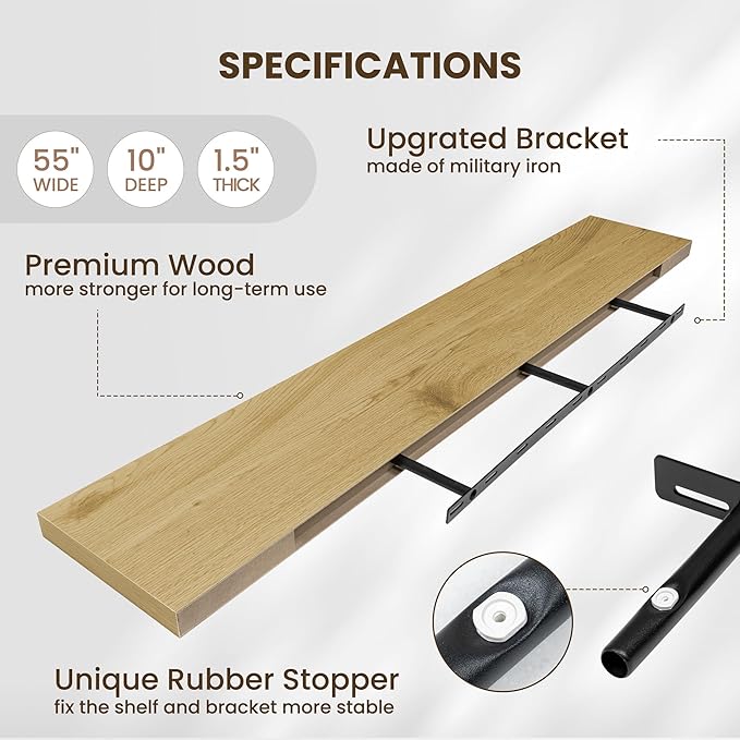 - VERSATILE WALL SHELVES: This 55 inches floating shelf is a versatile solution for any room in your home. Whether used in the living room, bedroom, office, or kitchen, it can be styled to suit various purposes, from displaying art to organizing everyday items. Perfect for enhancing any decor