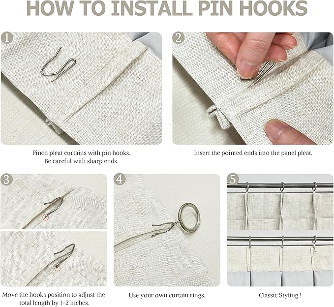 - Multiple Hanging Ways:The luxury curtain have many hanging options to meet your different home décor needs:back tabs(4 inch),clip rings,ring hooks or for track system. Please note that 18 hooks are in the package but clips and rings are not included.Two weighted hems sewn at bottom increase the draping effect.Moving the pinhooks position to adjust the total height by 1-2 inches