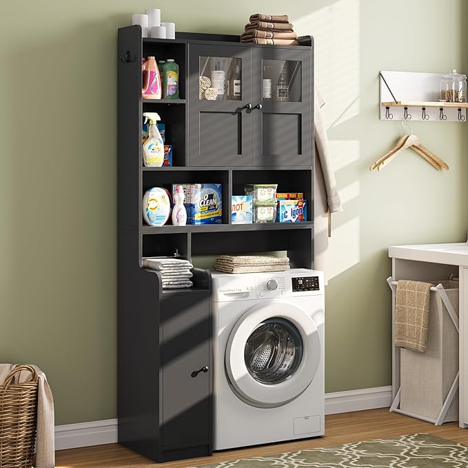 - 【What will you get?】Never worry about having too little space in your bathroom again! This above toilet storage cabinet comes with 2 tempered glass doors, 6 open shelves, 15.7'' deep vertical cabinet and toilet paper holder. Open shelves provide quick access to everyday essentials. Hidden storage space can be used for privacy items. All shelves are adjustable and can be used to store items at different heights. Ensure your bathroom stays organized.