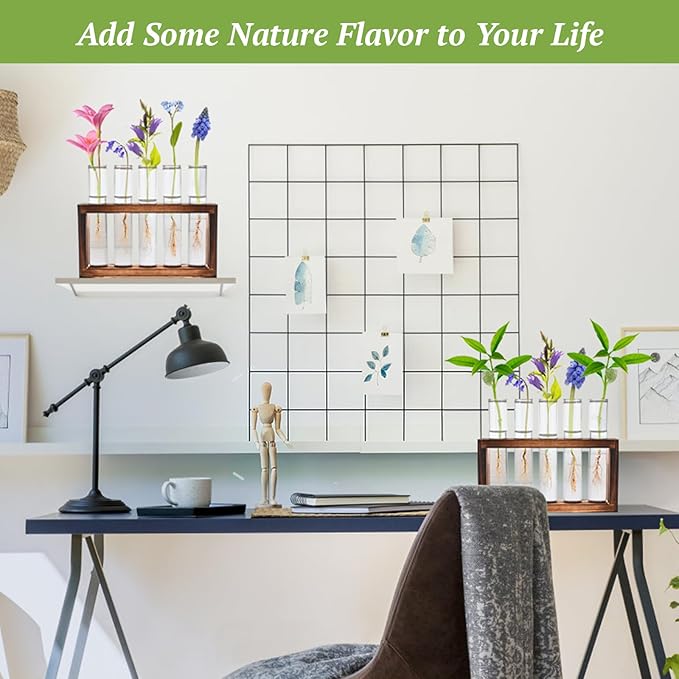 2pcs Desktop Glass Plant Propagation Station with 10 Test Tubes in Wooden Stand - Hydroponic Plants Cutting Office Home Decoration and Garden Decor Terrarium (10 Tubes)
