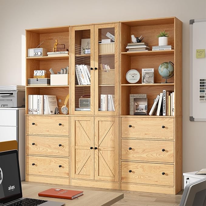 - 【Multifunctional Use】- The bookshelf with storage is designed with wood grain style and minimalist aesthetic, it seamlessly fits into any decor style. These wooden bookcases can be used as display cabinets, office bookshelves, library bookcass, kitchen pantry cabinets, etc