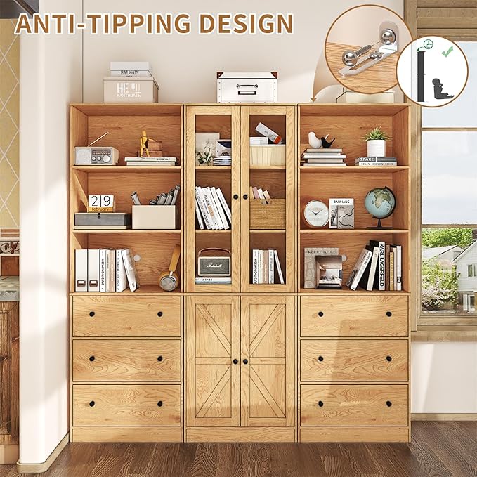 - 【71" Tall Bookcases Set of 3】- Two bookcases with 3-tire open shelves and 3 drawers + one 5-tier bookcase with doors are made of 0.6” thickness high-quality particleboard, waterproof and scratch-resistant, they are reliable and sturdy large bookcases. Equipped with anti-tipping iron plate, the natural bookcases are more stable to use