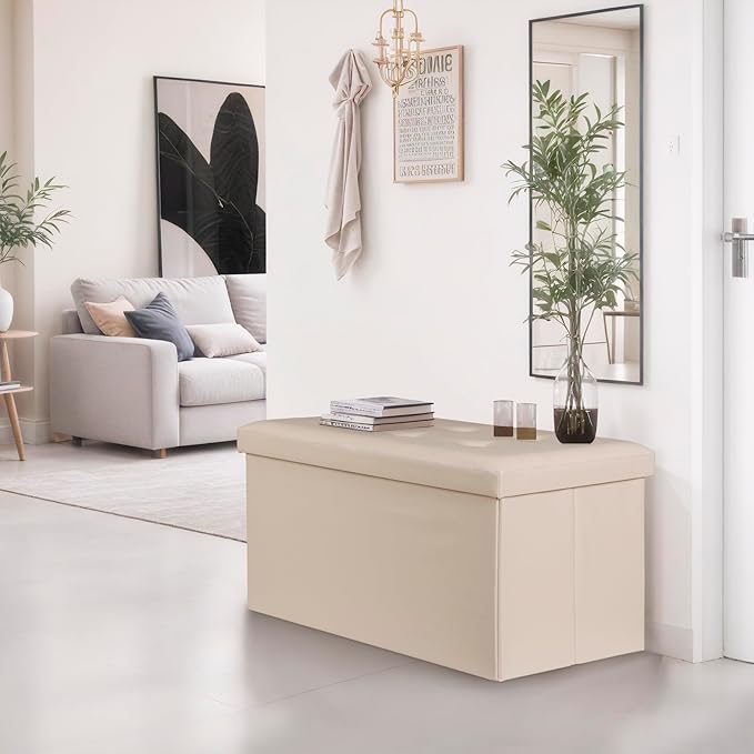 SUPER DEAL Folding Storage Ottoman Bench, 30 Inches Footrest Storage Bin with Padded Seat, Entryway Shoe Bench for Living Room Bedroom, 30"x15"x15", Faux Leather, Beige