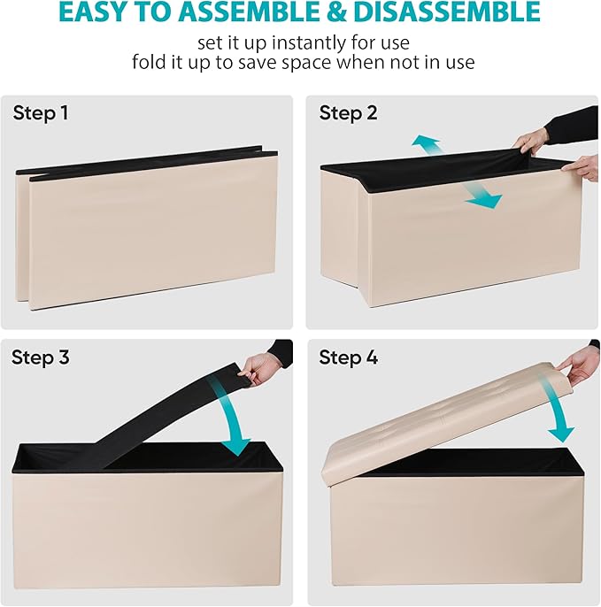 - 【Sturdy & Durable】This comfortable long storage ottoman is made of quality thick cardboard, durable faux leather, has the load bearing capacity up to 350lbs. Waterproof linen fabric, built-in thickened sponge, make the cushion is soft and comfortable. Beige unit you see everywhere and a perfect match to your couch or dining room chairs