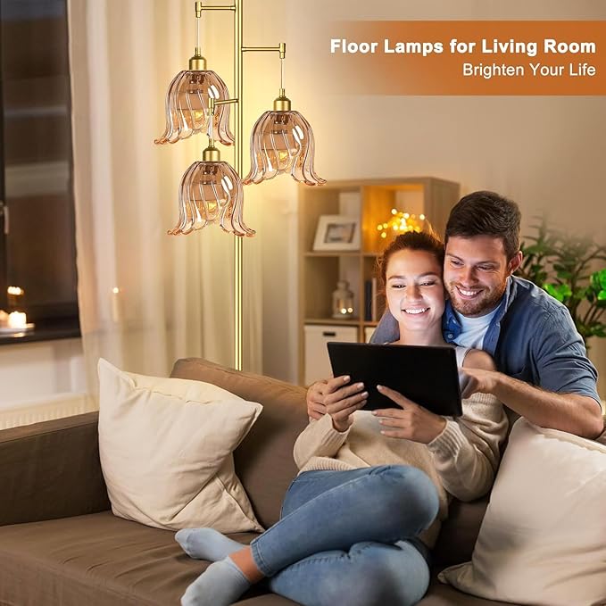 Gold Floor Lamp for Living Room,Bedroom,Tree 3 Light Standing Lamp Mid Century Modern Brass Tall Floor Lamps Vintage Retro Floor Lights Glass Flower Amber Lamp Shade Farmhouse Boho Bohemian
