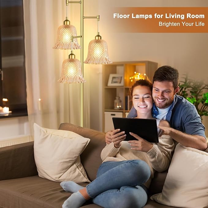 Gold Floor Lamp for Living Room,Bedroom,Tree 3 Light Standing Lamp Mid Century Modern Brass Tall Floor Lamps Vintage Retro Floor Lights Glass Green Flower Lamp Shade Farmhouse Boho Bohemian