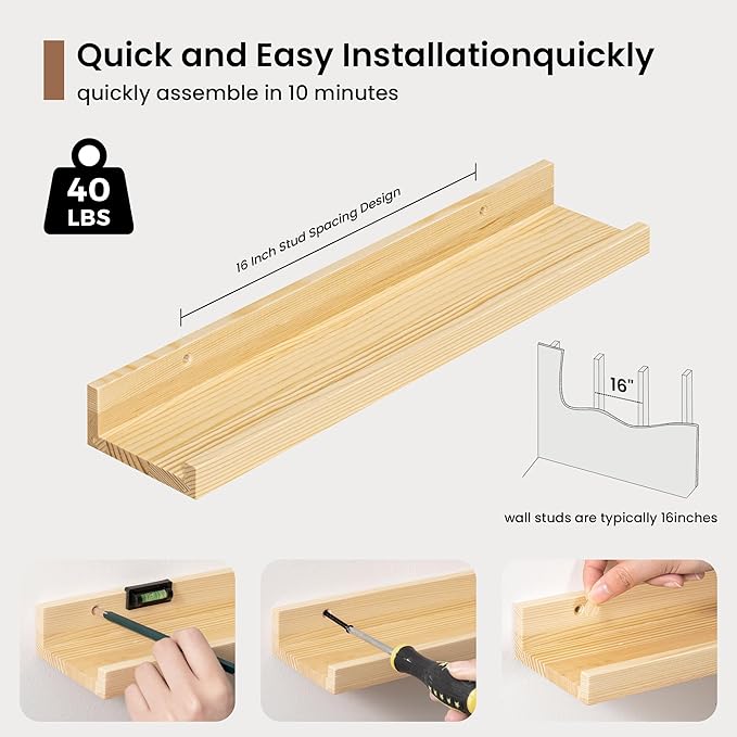 - Easy to Install: Fun Memories fully assembled solid pine wood picture ledge shelf set of 2 comes with the pre-drilled holes and necessary hardware including a mini level to make installation a breeze. The floating design creates a seamless, streamlined look, adding a touch of modern sophistication to your interior. If you have any questions about our products, please feel free to contact us