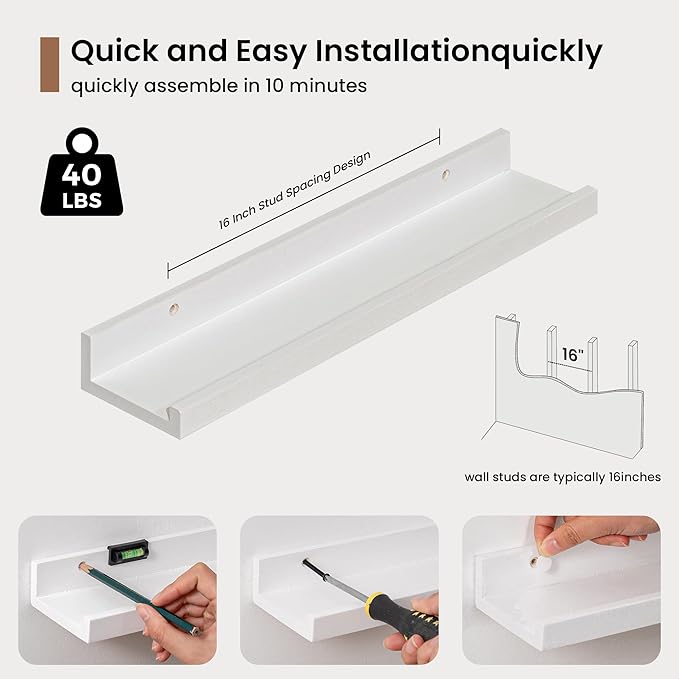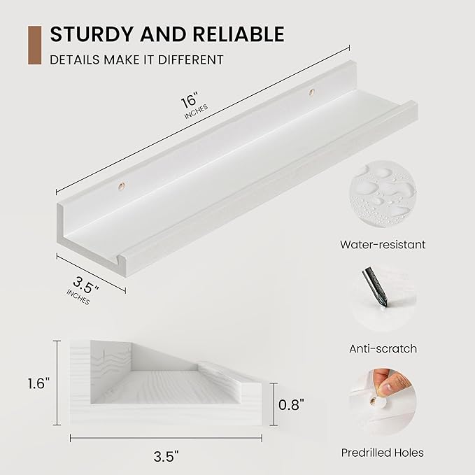 - 3.5" Floating Picture Ledge: Anti-Slip Narrow Design-3.5" ultra-narrow depth holds frames/plants without sliding, even on angled walls. Stud-Mounted Stability-16" pre-drilled holes match standard studs (hardware incl.) for wobble-free install. Clutter-Free Aesthetic-Clean lines blend with farmhouse/Scandinavian decor, focusing on your treasures