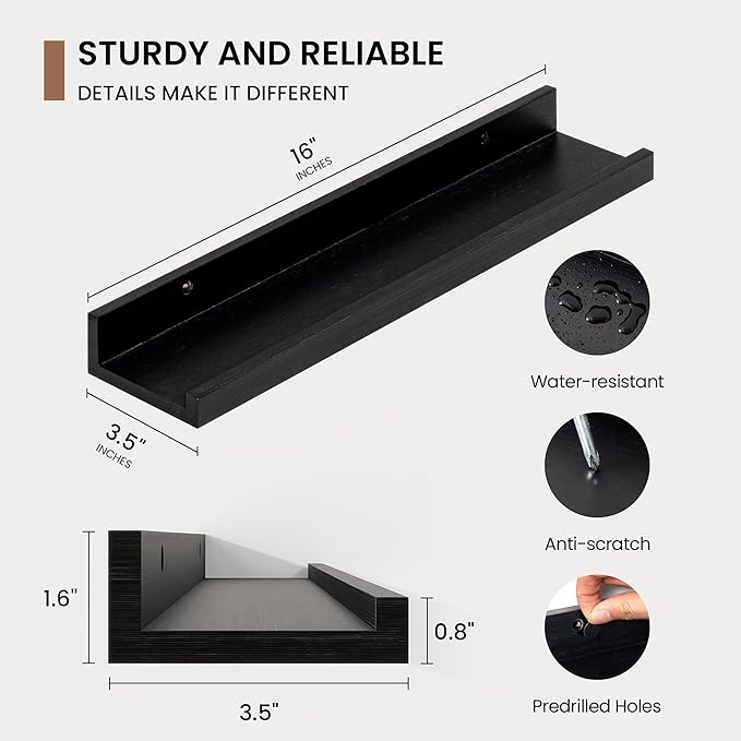 - 3.5" Floating Picture Ledge: Anti-Slip Narrow Design-3.5" ultra-narrow depth holds frames/plants without sliding, even on angled walls. Stud-Mounted Stability-16" pre-drilled holes match standard studs (hardware incl.) for wobble-free install. Clutter-Free Aesthetic-Clean lines blend with farmhouse/Scandinavian decor, focusing on your treasures