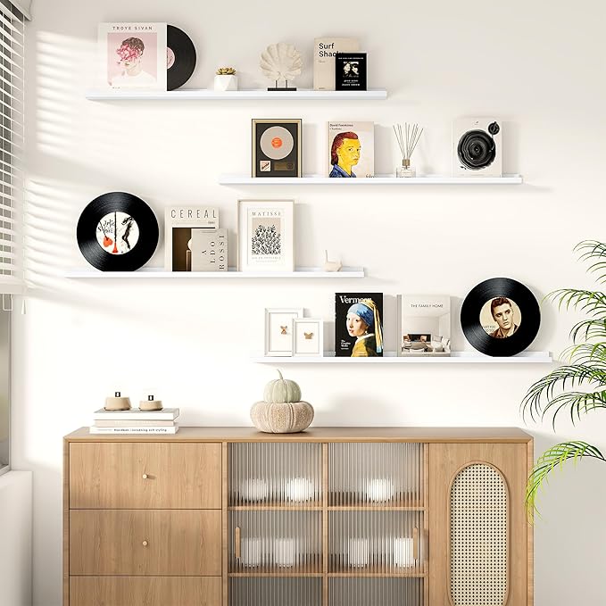 - NO ASSEMBLY REQUIRED: Fun Memories fully assembled long floating shelf set of 4 comes with the pre-drilled holes and necessary hardware including a mini level to make installation a breeze. The floating design creates a seamless, streamlined look, adding a touch of modern sophistication to your interior