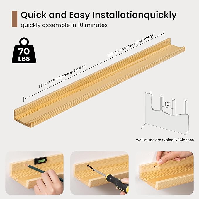 - Easy to Install: Fun Memories fully assembled solid pine wood picture ledge shelf set of 2 comes with the pre-drilled holes and necessary hardware including a mini level to make installation a breeze. The floating design creates a seamless, streamlined look, adding a touch of modern sophistication to your interior. If you have any questions about our products, please feel free to contact us