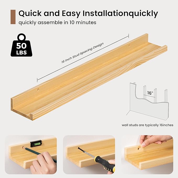 - Easy to Install: Fun Memories fully assembled solid pine wood picture ledge shelf set of 2 comes with the pre-drilled holes and necessary hardware including a mini level to make installation a breeze. The floating design creates a seamless, streamlined look, adding a touch of modern sophistication to your interior. If you have any questions about our products, please feel free to contact us
