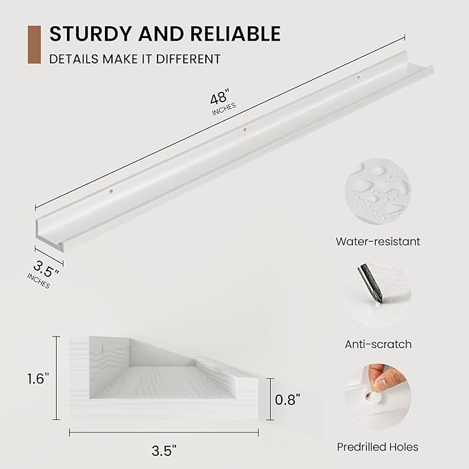 - 3.5" Floating Picture Ledge: Anti-Slip Narrow Design-3.5" ultra-narrow depth holds frames/plants without sliding, even on angled walls. Stud-Mounted Stability-16" pre-drilled holes match standard studs (hardware incl.) for wobble-free install. Clutter-Free Aesthetic-Clean lines blend with farmhouse/Scandinavian decor, focusing on your treasures