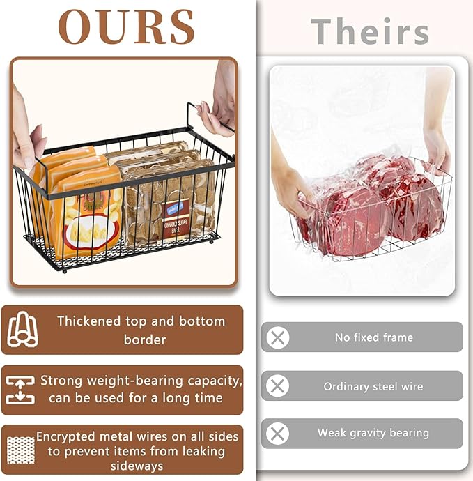 - Thickened Frame and Four-Sided Metal Mesh: Our chest freezer organizer bins are made of high-quality metal, with reinforced and thickened upper and lower frames and dense metal mesh design on all four sides, providing stronger load-bearing capacity and resistance to deformation. Therefore, this chest freezer organizer is more durable compared to regular models.