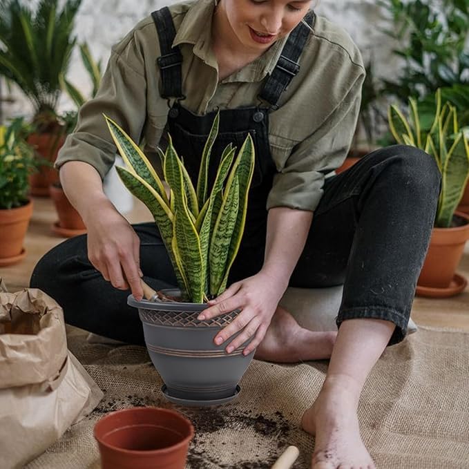 6 Pack 8 Inch Plant Pots, Plastic Flower Pot for Indoor & Outdoor with Drainage Holes & Saucer, Plaid Pattern Planters Garden Pots for Herbs
