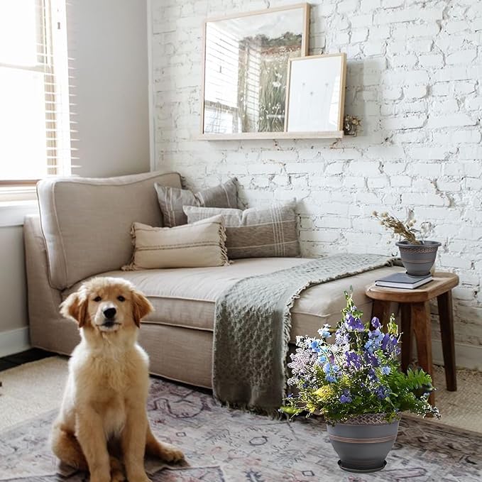 - Drainage Hole and Saucer - There are 8 drainage holes at the bottom of our garden pots, which can control excess water, increase the breath ability and benefit the growth of plants; the lightweight saucer can not only collect excess water,but also keep your floor or desktop clean.
