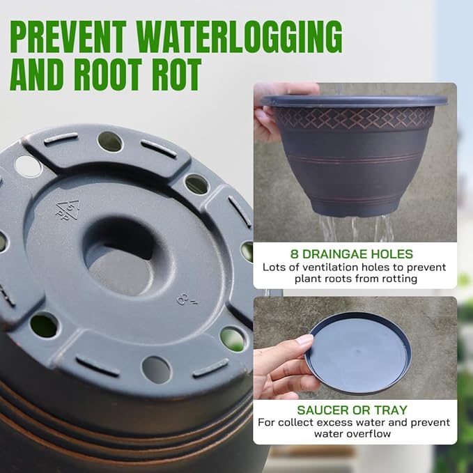 - Drainage Hole and Saucer - There are 8 drainage holes at the bottom of our garden pots, which can control excess water, increase the breath ability and benefit the growth of plants; the lightweight saucer can not only collect excess water,but also keep your floor or desktop clean.