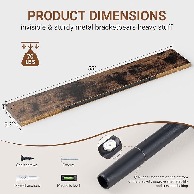 - 【Longer Design】Our pretty wall shelves are 55"W x 9.3"D x 1.5"H.Our brown floating shelves is longer than traditional designs and can hold more items.The rustic brown floating shelves optimize wall space,helping organize essentials without taking up floor space in your home.