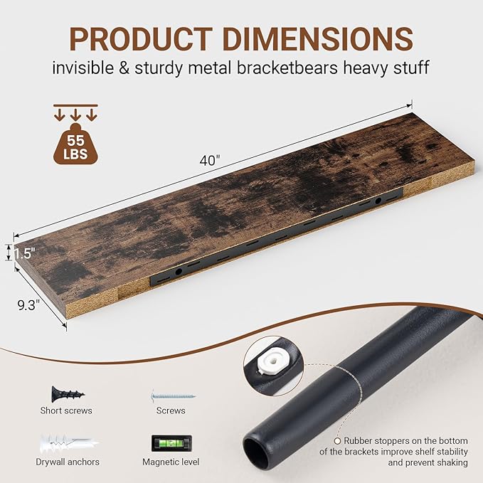 - 【Longer Design】Our pretty wall shelves are 40"W x 9.3"D x 1.5"H.Our brown floating shelves is longer than traditional designs and can hold more items.The rustic brown floating shelves optimize wall space,helping organize essentials without taking up floor space in your home.