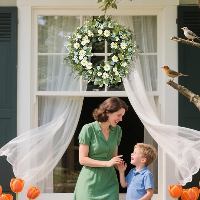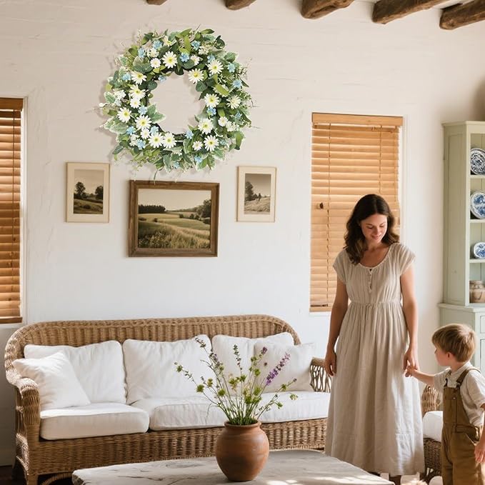 - 4. Seasonal Versatility: Designed to brighten any season, this wreath is a versatile choice for your home. Its cheerful white and blue daisies are perfect for spring and summer, while its timeless design makes it a great fit for farmhouse, modern, or rustic decor all year round