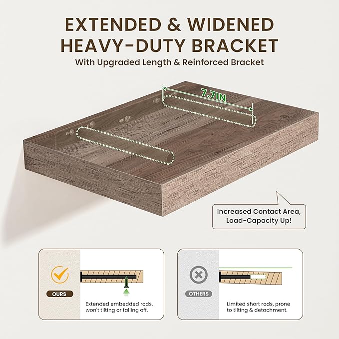 - UPGRADED MOUNTING SYSTEM-The extended supporting bars on the metal brackets ensure our wall shelves remain sturdy, preventing any wobbling or sagging. Plus, the included plastic plugs guarantee the shelves to stay firmly in place
