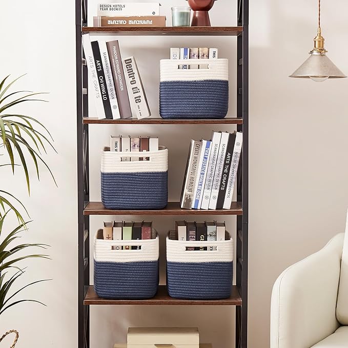 OIAHOMY 4 Pack Storage Baskets for Organizing, Basket for Shelves with Handle, Woven Baskets for Storage Toys, Towels, Books, Cotton Rope Basket 13" L x 9 " W x 7.8 " H, Blue & White