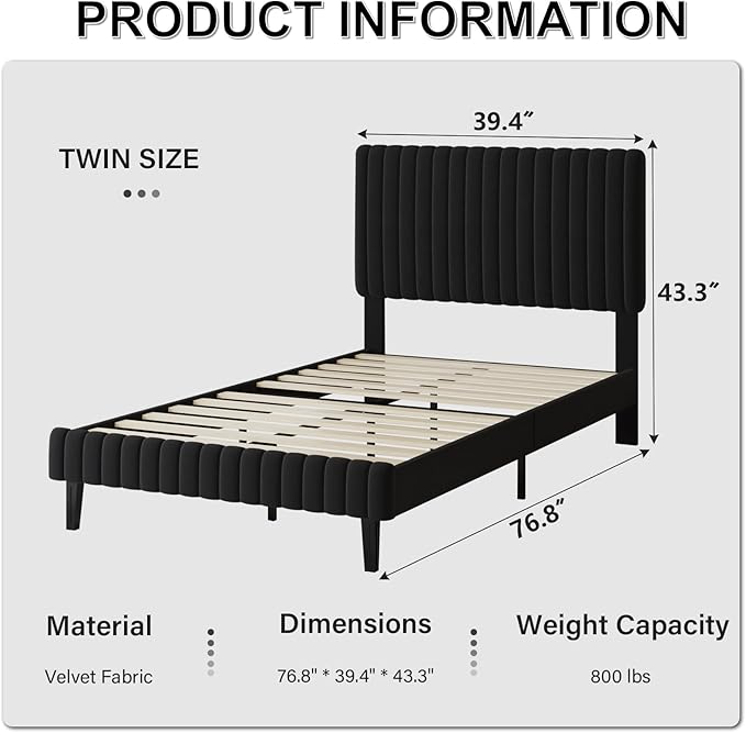 Twin Bed Frame, Velvet Upholstered Platform Bed with Vertical Channel Tufted Headboard and Footboard, No Box Spring Required, Easy Assembly, Black