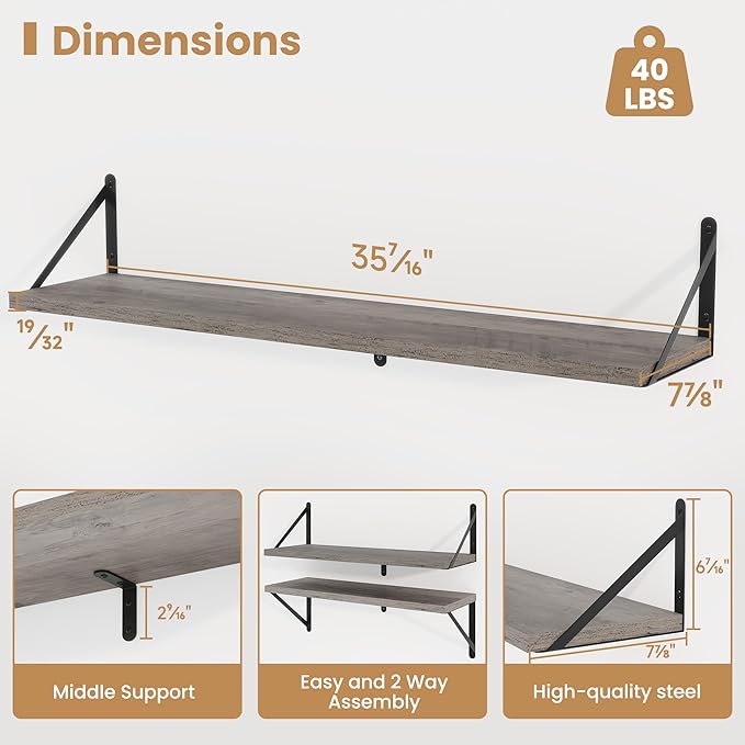 - 【Practical Wall Bookshelf】Our 35.4"W x 8"D floating shelves are your good helpers if you need extra storage space,or want to add green decorations-small indoor plants,photo frames,collection books. These floating bookshelves can free up floor and counter space,making bedrooms,living rooms and offices more tidy.