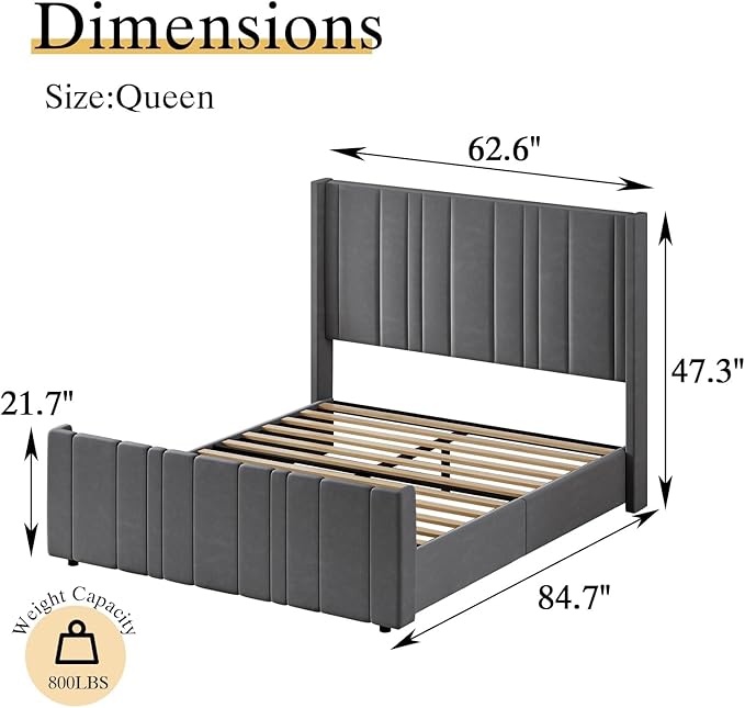 - Vertical Channel Tufted Design: This modern queen bed frame has a 47.3" high headboard and 21.7" footboard to keep the mattress from sliding. The queen upholstered bed frame features velvet in soft fabric and provides extra support for your neck and back