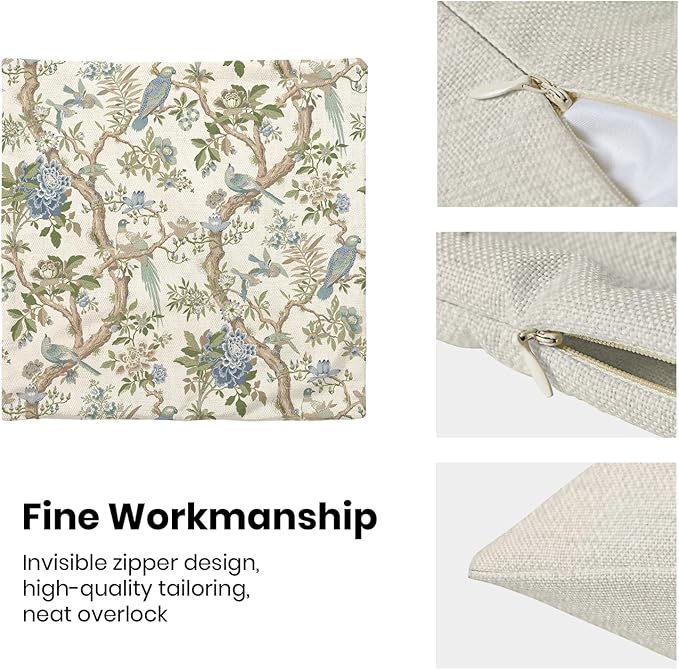 - 【Square Pillow Covers Size】 Chinoiserie flower birds pillow case set includes 2 pcs of farmhouse couch pillow covers (NO Pillow). Home decor farmhouse pillow covers measures 20x20 inch/ 50x50 cm. All the floral decor throw pillow covers have a hidden zipper. It is easy to insert or remove the pillow core to replace the spring pillowcase. Easy to clean and wash, sturdy and not easy to damage.