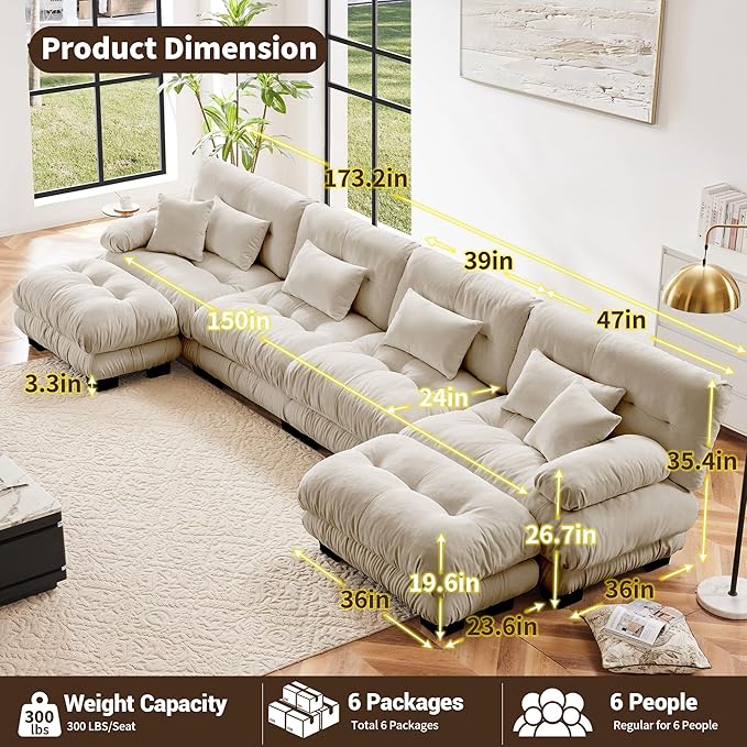 U Shaped Couch Sectional Couch, 4-Seater Cloud Couch Sectional Oversized Couch, Sofa Bed Couch with Round Bolster Armrests 6 Pillows, Modular Couch Home Sofa Living Room Couch
