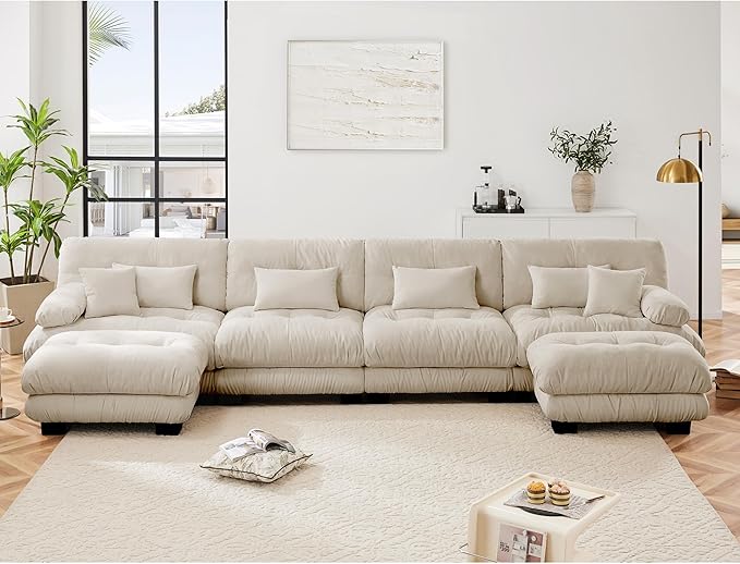 - Oversized U-Shaped Couch: This is a modern sectional couch with 2 ottoman. The 4-seater sofa couch is made of soft, durable, and exquisite vintage chenille fabric, it offers comfort and soft seating for everyone sitting on it. Exquisite round bolster armrest designs with well-filled inside provide comfort support for the hands, while sitting on it the bolster armrest can also provide your head with the appropriate radian and support