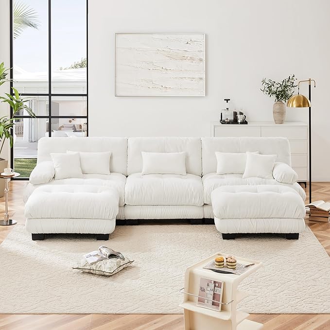 U Shaped Couch Sectional Couch, 3-Seater Cloud Couch Sectional Oversized Couch, Sofa Bed Couch with Round Bolster Armrests 5 Pillows, Modular Couch Home Sofa Living Room Couch(White)