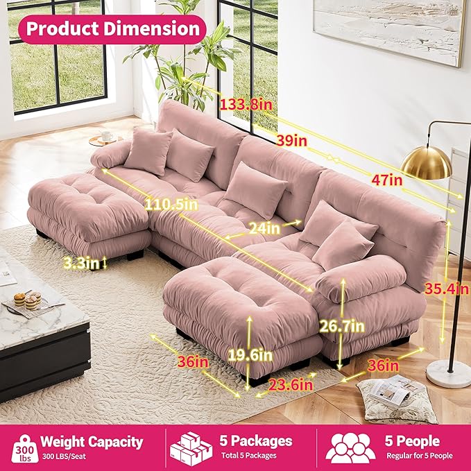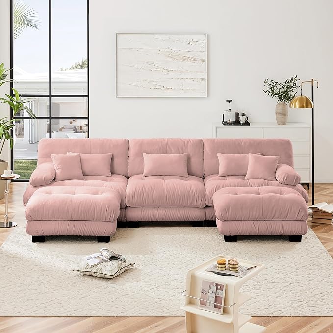 U Shaped Couch Sectional Couch, 3-Seater Cloud Couch Sectional Oversized Couch, Sofa Bed Couch with Round Bolster Armrests 5 Pillows, Modular Couch Home Sofa Living Room Couch(Pink)