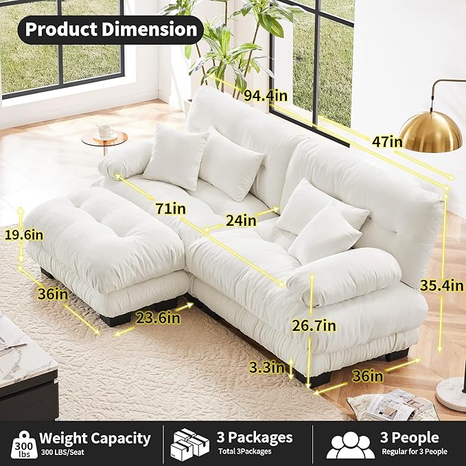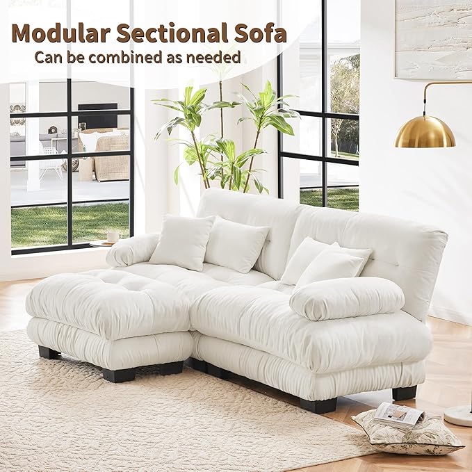 Loveseat Modular Sectional Sofa, L Shaped Couch with Ottoman, Cloud Couch Sectional Couch Home Sofa Living Room Oversized Couch Deep Seat Couch with Round Bolster Armrests 4 Pillows(White)