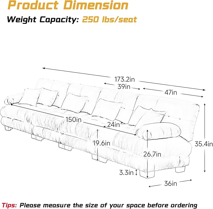 - Product Dimensions : 36"D x 173.2"W x 35.4"H