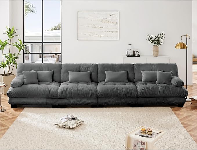 - Modular Sectional Sofa: This is an oversized sectional couch for living room. The 4-seater cloud couch is made of soft durable chenille fabric, it offers comfort and soft seating for everyone sitting on it. Exquisite round bolster armrest designs with well-filled inside provide comfort support for the hands, while sitting on it the bolster armrest can also provide your head with the appropriate radian and support